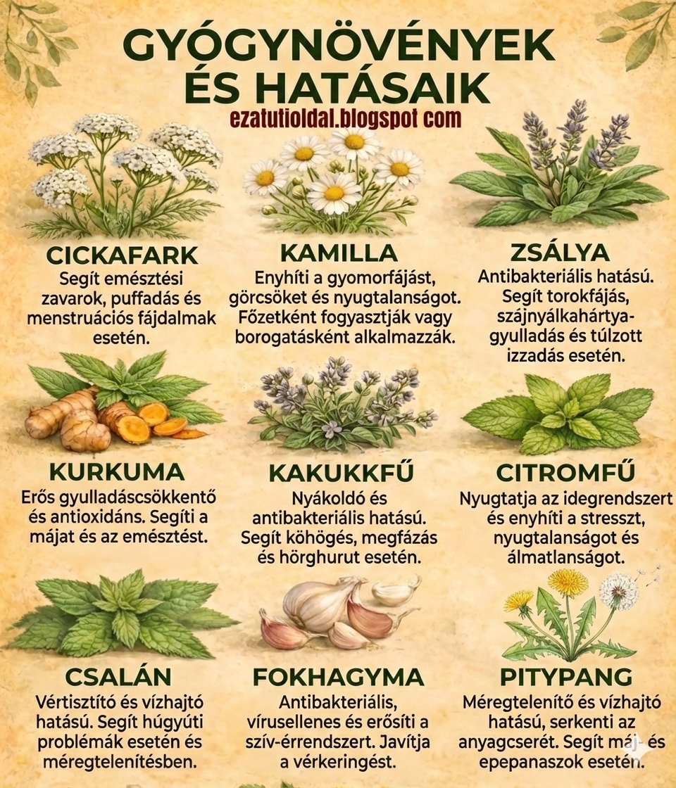 A természet patikája évezredek óta kínál megoldást mindennapi panaszainkra. Ebben a cikkben kilenc különleges gyógynövényt mutatunk be, amelyek segíthetnek az emésztés javításában, a stressz csökkentésében és az immunrendszer erősítésében. Megismerhetjük a cickafark, a kamilla és a zsálya jótékony hatásait, valamint kiderül, miért érdemes a kurkumát vagy a csalánt beépíteni az étrendünkbe. Legyen szó megfázásról, puffadásról vagy egyszerűen csak a szervezet méregtelenítéséről, ezek a növények szinte mindenre kínálnak természetes alternatívát. Fedezd fel, hogyan válhatnak a konyhai fűszerek és a kertben növő füvek az egészséged őreivé, és hogyan alkalmazhatod őket biztonságosan a hétköznapokban.