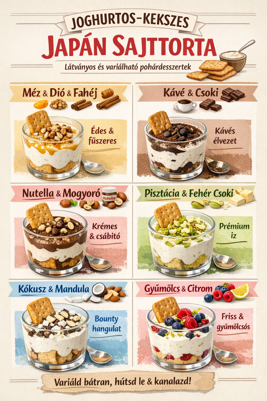A desszert lelke a sűrű görög joghurt, amelyhez keksz, majd különféle ízesítők kerülnek amit a végén díszíteni is lehet . Sütés nélkül készül, állaga krémes, könnyű, mégis telt.