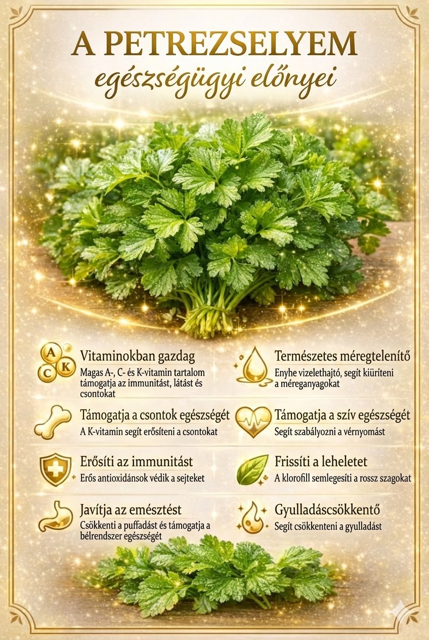 A petrezselyem nem csupán egy esztétikus dekoráció a tányérunkon, hanem egy rendkívül hatékony gyógynövény, amely komplex módon támogatja szervezetünket. Kiemelkedő K-vitamin-tartalma révén védi a csontokat, miközben A- és C-vitaminnal turbózza fel az immunrendszert és a látást. Természetes vizelethajtóként segíti a méregtelenítést, káliumtartalmával pedig hozzájárul a szív egészségéhez és a vérnyomás stabilizálásához. Illóolajai és klorofilltartalma javítják az emésztést és frissítik a leheletet, flavonoidjai pedig hatékonyan küzdenek a gyulladások ellen. Érdemes tehát frissen, akár saláták alapanyagaként vagy turmixokba keverve is rendszeresen fogyasztani ezt az elérhető, mégis filléres szuperélelmiszert.