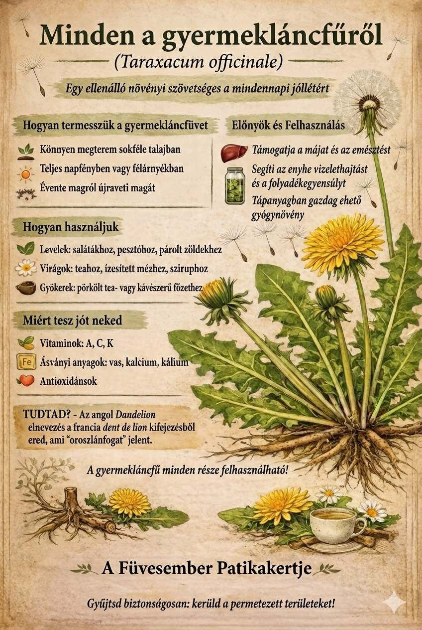 Sokan csak makacs gyomként tekintenek rá, amely sárga foltokkal „csúfítja” el a tökéletes angolpázsitot. Pedig a gyermekláncfű (Taraxacum officinale) – vagy ahogy a népnyelv hívja: pitypang – az egyik legsokoldalúbb gyógynövényünk. Évszázadok óta a természetes patika alapköve, hiszen minden része, a gyökerétől a virágáig, értékes hatóanyagokat rejt.
