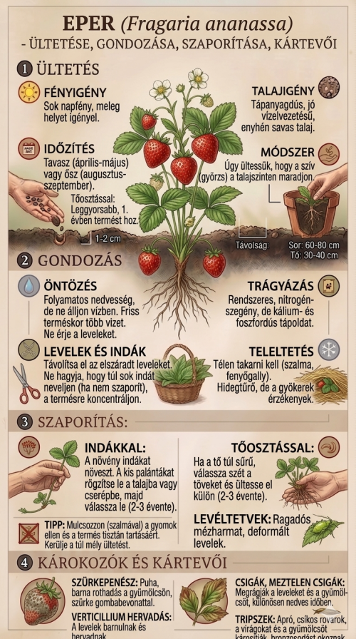 Ebben a cikkben végigvesszük az eper életútját az ültetéstől a szüretig, kitérve a szaporításra, és arra is, hogyan védhetjük meg növényeinket a betegségektől és kártevőktől.