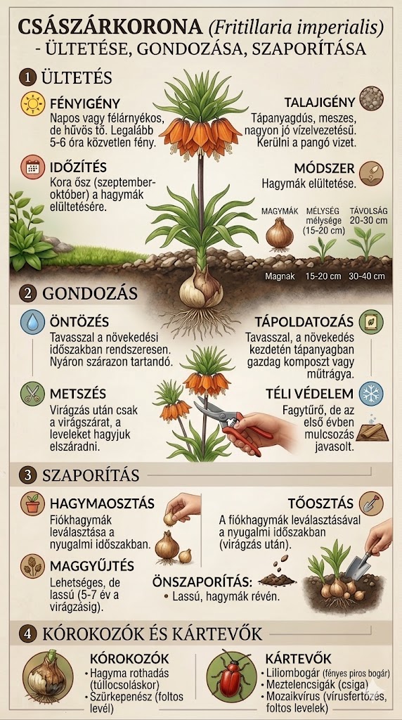 Fontos megjegyzés: A császárkorona minden része, különösen a hagymája, mérgező alkaloidokat (pl. imperialin) tartalmaz. Ültetéskor és gondozáskor javasolt a kesztyű használata.